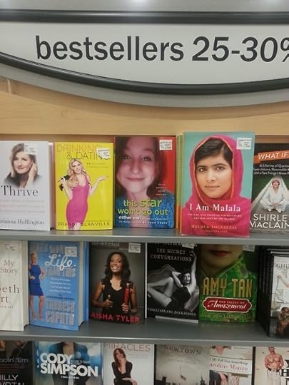I rounded the corner and happened upon Esther’s beautiful smile! This was the first time I’ve seen the book apart from online and copies I’ve ordered [I haven’t had much chance to be in a book store lately] and wanted to commemorate it. So, This Star Won’t Go Out got a nerdfighter note as well!