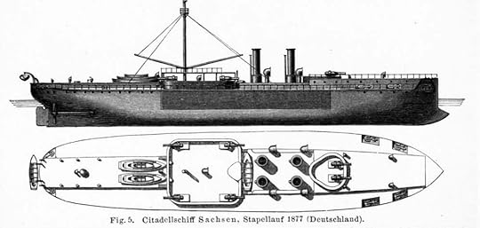 The first “modern” German cost defence vessels were of the four-ship Sachsen class, 7,635 tons and 322-ft long. Built between 1877 and 1880, they were designed to operate as part of an integrated coastal defence network and intended to sortie from fortified bases to break up enemy blockades or attempted landings. They were to operate close to shore and not on the high seas. Armed with six 10-inch guns in open barbettes, as well as smaller weapons, the Sachsens were powerful ships for the time. Their unusual layout allowed at least two of her 10-inch guns to fire on all bearings. (As in other navies, blast-effects on the decks and superstructure seem to have been disregarded or underestimated). Their four funnels, set at the corners of a rectangle, apparently suggested the nickname of “The Cement Factories”.