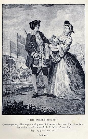 An engraving by Boitard entitled “The Sailor’s Return” shows an officer who has come back with Anson and in the background the treasure captured in the Spanish “Manilla Galleon” is being conveyed to London under the armed escort of sailors and marines. Louis Philippe Boitard was of French extraction, but settled in London. Robinson notes rather primly that “Some of Boitard’s pictures are too coarse for reproduction, notably that of “The Strand in an Uproar” – some sailors retaliating for the ill-treatment of one of their messmates in a house of ill-fame by throwing the furniture into the street”. I regret that I have been able to find a copy to include with this article!