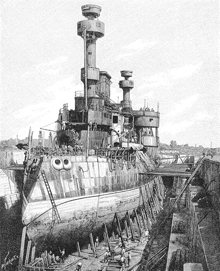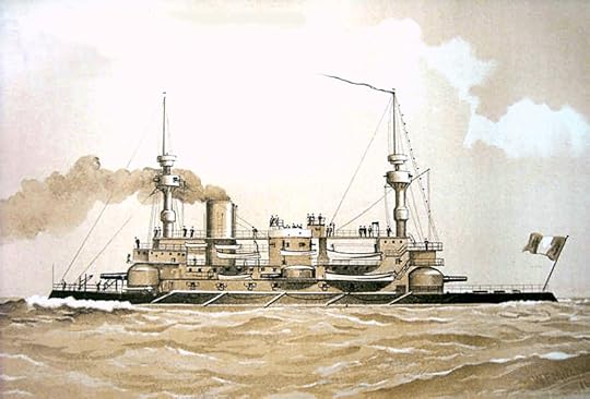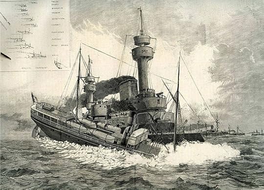 Another addition to the sad list of ramming disasters occurred in July 1892 and involved the French battleship Hoche. When she entered service in 1890, this vessel represented the epitome of a major warship designed as much for ramming as for carrying heavy guns. Entering service in 1890, this 12,000-ton, 322-foot vessel was protected along her waterline by an armoured belt 18-inches thick while her main armament, of two 13.4-inch and two 10.8-inch cannon, was protected by up to 16-inches of armour. Two features were especially notable – the enormous and untidy superstructure, that led to her the nickname of “Le Grand Hotel”, and the long ram-bow that ended in a vicious point some eight feet below water level.