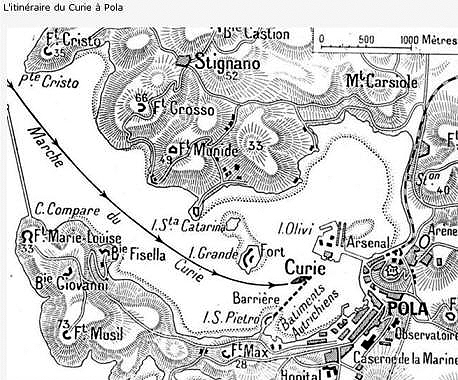 The Curie, launched in 1912, belonged to the Brumaire-class, with diesel power for surface running. In August 1914, when France and Britain went to war with the Central Powers – Germany and Austro-Hungary – Curie was assigned to supporting the French Navy’s attempt to close off the Otranto Straits between Southern Italy and Greece. By so doing they would bottle-up the efficient and locally powerful Austro-Hungarian navy within the Adriatic. Blockade was however a slow process and more daring spirits considered the possibility of infiltrating a submarine into the main Austro-Hungarian naval base at Pola, close to the head of the Adriatic, so as to sink major units moored there.