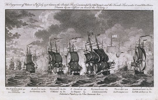The Royal Navy’s Channel Fleet was commanded by Admiral Augustus Keppel (1725 – 1786), who can be described as competent but not brilliant. Like many officers of the era he had a parallel political career as a Member of Parliament and bad blood existed between him, as a committed Whig, and the First Lord of the Admiralty, the Navy’s professional head and a dedicated member of the opposing group known as “The King’s Friends”. The depth of bitterness was such that Keppel feared that the First Lord would be glad for him to be defeated. Further bad feeling existed between Keppel and one of his subordinate admirals, Sir Hugh Palliser (1723–1796), another politically active officer and previously a member of the Admiralty Board, which Keppel blamed for the running down of the Royal Navy in the aftermath of the Seven Years War. These personal enmities did not bode well for mutual trust and cooperation in the heat of battle.