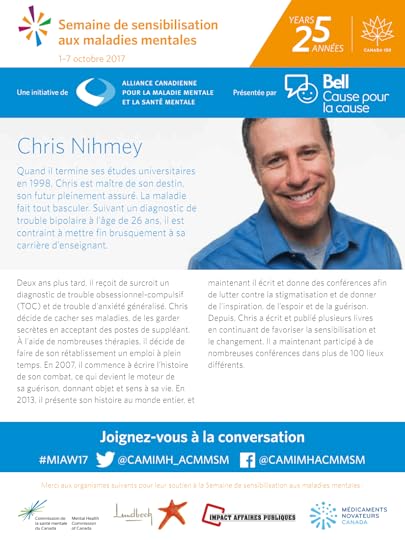 Graduating from university in 1998, Chris had the world in his hands, his future fully planned. Sickness changed everything. After a diagnosis of Bipolar Disorder at 26, he was forced to end his teaching career abruptly. Two years later, he was additionally diagnosed with Obsessive-Compulsive Disorder (OCD) and Generalized Anxiety Disorder. Chris made a decision to hide his illnesses, keeping them a secret while resorting to supply teaching. Working on his healing through numerous therapies, he made recovery a full-time job. In 2007, he began writing a story about his battle. This became a driving force in his healing, bringing him purpose and meaning. In 2013, he released his story worldwide, and now writes and speaks, to fight stigma, and to provide inspiration, hope and healing. This has led Chris to write and publish several books, while continuing to promote awareness and change. He has now spoken at well over 100 venues.