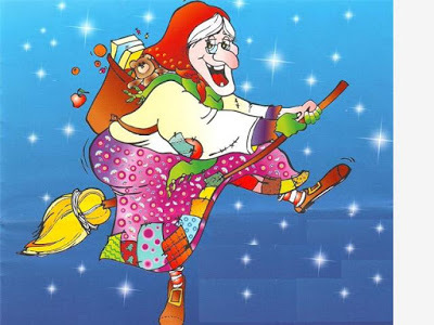 On the eve of the epiphany she climbs down chimneys to find stocking hanging near the fireplace. From her basket to places candy, fruit, toys and books in the stockings of the good children goes; but naughty ones receive coal, onions or garlic. In return the families leave wine and cakes for her. A smiling but very old woman with a slight hunch, she still wears rags with colourful patches covered with soot from climbing down the chimneys.