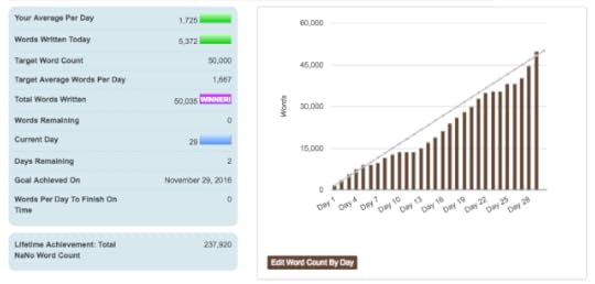 I made a big push the last few days to finish my 50,000 word novel installment and am proud to say I made it over the finish line last night! You can see from the following plot how I had a few slow spots this month--the one right after the election is probably self-explanatory since I, like many people, was in shock and non-verbal for a few days. Writing has been a great healing aid during this period, though, and I highly recommend it for getting centered on one's own life again. Give it a try!