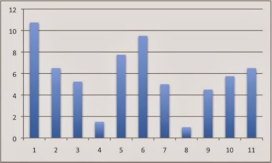 My writing had, like most people's, slowed down quite a bit over the holidays, but has begun to pick up speed again this month, as can be seen in this graph of "Hours Spent Writing Each Week," vs. the weeks in November, December and January. Those two low spots, in weeks 4 and 8, are (you guessed it) Thanksgiving and Christmas.
