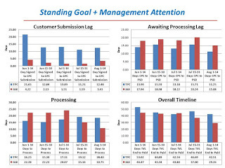 For decades, the standing goal for travel claim processing has been 30 days from the end of travel (TVL End) to paid. Conventional wisdom viewed the standing goal as somewhat unrealistic though, because a portion of the timeline is dependent on the customer's timeliness. Wisdom says that if the customer submission lag is very long, then the travel claim processor cannot meet the 30-day goal.
