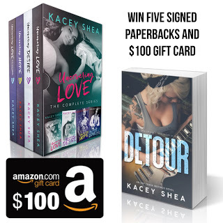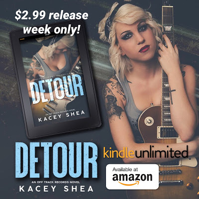 Enjoy this excerpt from lead singer of Three Ugly Guys, Trent Donavan from Kacey Shea’s rock star romance, Detour: The dive is actually charming inside, with its retro fifties décor and twenty-four-seven breakfast menu. The crowd is popping for a weekday lunch, and with its location in the heart of downtown I take that as a sign the food will be good.A no-nonsense waitress leads us to an empty booth near the back.“This okay?” Her tone dares us to suggest it’s not . . . and end up with spit in our meal.“Perfect. Thanks.” Lexi slides into the seat across from me. The waitress points to where the menus are nestled between the table and a dish of creamer, sugar packs, and other condiments.“What can I get you to drink?”“I’ll have a glass of orange juice,” Lexi says and then glances at me. “And I don’t need to see the menu. I’m ready to order. If you are?”“Yeah.” I’m surprised, since most people scan the menu before deciding on their meal.“A stack of plain pancakes. Please,” she says.“You want the half or the full?” our server asks without looking up from her notepad.“Full, please.” Lexi smiles.The waitress pauses to glance at Lexi and raise her brows. “Mmm’kay. And for you?” She nods my direction more than asks.“Same. Except coffee for me.”“’Kay.” She turns and leaves without a backward glance.“I don’t know how you do that,” I say.“What? I can eat a lot of food. Especially pancakes. Don’t judge me by my size.”I grin. “Not that. I’m talking about ordering orange juice.”“You don’t like OJ?” she asks as if I’m the crazy one.“I do. But you have no idea the pulp situation. Does it have none, or extra? How can you order a glass without knowing the level of pulp?”She laughs and at that moment our server comes back to set down our drinks. “Pancakes’ll be up shortly.”“I take it you’re not a fan of pulp.” Lexi observes and takes a sip from her drink.I eye her from over the brim of my mug. “That obvious?”She laughs and sets down her glass. “You’ll be happy to know there’s a low pulp situation going on. We’re safe here.”“Thank God!” I bug my eyes and delight in the way her lips lift in a comfortable smile. Not forced or guarded. I like this Lexi. “Hey, there’s something I’ve been wanting to ask you since we met.”Her shoulders straighten just the slightest and I can’t help but kick myself for chasing away some of her ease. “You don’t have to answer, if you don’t want. Just call me curious.”“Fine.” She rolls her eyes but her lips twitch up with the trace of a smile. “Shoot.”“Why Marx?” The words leave my mouth and I instantly regret the question.Her eyes drop and her jaw hardens with her frown. She studies the patterned Formica table and traces her fingertips along the silver plated fork and spoon atop her paper napkin. Fuck. She was just starting to open up. Talk to me. Now she’s like ice. I should apologize. Or make a joke. An inappropriate one about her luscious breasts. Yes, then she’ll get angry. Angry I can do.“Don’t laugh,” she warns.My gaze snaps up to watch her still playing with the silverware. “Okay.”“Swear it.”I reach my hand across the table and set my fingers next to the napkin. “Pinky promise.” I wiggle my finger and her lips soften as though she wants to smile. “I won’t tell a soul.”Her pinky slides along mine, and the soft brush of her tiny finger against my much bigger one kicks up my pulse. Her hands are so delicate and skilled, and fuck if my dick isn’t already making my tight jeans irritably uncomfortable. She squeezes her finger and I barely lock mine with hers before she pulls her hands back into her lap.“I was a child. I can’t be held responsible.” She glances around the room before her gaze settles back to me. “But I had a major crush on Richard Marx.”“The singer?” I press my lips together because I’m certain there’s a smile stretching across my face.Lexi’s glare confirms my suspicion. “Not a word. You promised.”“I won’t. It’s cute. What were you, like five?”“More like twelve.”“But you’re only twenty-three, right? Wasn’t Marx big in the late eighties, early nineties?”“Yeah, well, my mom loved his music so we listened to it a lot.”“You’re telling me your stage name is a shout out to the guy who romanced millions of women with his piano and soft rock ballads, all from a little childhood crush?”“Don’t judge, okay. I was a kid.” Even she can’t hold back a laugh.“Not judging, just finding the connection rather shallow for a woman who does everything with great meaning.”Her eyes narrow. “I’m not sure if you’re trying to compliment or insult me.”I wink. “Compliment. Go with the positive.”“You’re delusional.” She throws up her hands.“Says the Marx diehard fan!”“Look. It’s more than that,” she grumbles and when I tilt my head she shakes hers, her next words leaving her lips in a rush. “God, I can’t believe I’m telling you this . . . When I was a young girl I had this ridiculously famous rock star dad. One who was a horrible father. One who never remembered to call or visit, and who made my mom cry herself to sleep. One who made her waste her entire youth devoted to a man who didn’t give two shits about us.When I listened to “Right Here Waiting,” I used to pretend that my dad wasn’t Richie Sands. That my mom had gotten it all wrong. I imagined my father was Richard Marx and he was singing that song to us—my mom and me. That he loved us.” She gave a short pause. “So as soon as I turned eighteen, I legally changed my last name to Marx.”“Two big stacks.” Our server interrupts by setting down our plates with a clatter. “Refills?”“Yes, please,” Lexi answers. However, I can’t seem to move my gaze from her eyes. The green shines a little too brightly under the florescent lights while she p