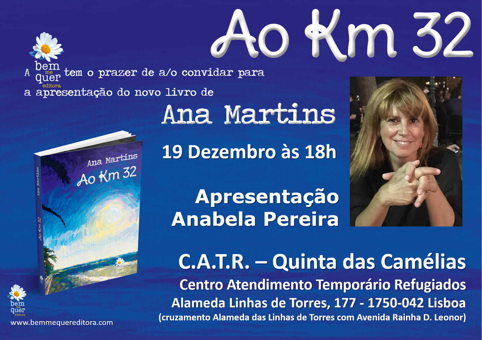 Dia 1 Dezembro às 14hDivulgação do Livro "Ao Km 32" no Glicínias Plaza, AveiroDia 2 Dezembro às 15hLançamento do Livro "Ao Km 32" no Museu Arte NovaSessão de Autógrafos no Cais da Fonte NovaPresença no podium da Maratona São Silvestre na cerimónia de entrega de medalhas para entrega de livrosDia 5 Dezembro às 17hApresentação do Livro "Ao Km 32" no Auditório Livraria da Universidade AveiroDia 12 Dezembro às 9:30hPalestra "Ao Km 32" na Biblioteca da ES Dr. Mário Sacramento, AveiroDia 15 Dezembro, Lisboa?(data local a serem confirmados)