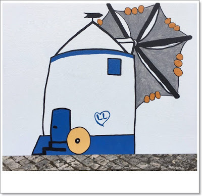 Na Praça Marquês de Pombal, mesmo junto ao posto de correios aí existente, estava um disponível que me foi atribuído. Inicialmente pensei pintar cartas e postais a voar na direcção do edifício dos CTT, que depois evoluiu para esta outra ideia, visto que no meu primeiro livro publicado há um conto - uma bonita história de amor - em que o narrador é um postal. Isso mesmo, um postal dos CTT. Partindo do princípio que todas as histórias de amor serão lindinhas, o twist está na forma original de as contar para não ficarem sensaboronas (já Pessoa reclamava disso), então o recurso que usei no "Promessas de Verão" foi exactamente esse, criei um inusitado narrador, o postal que se extravia que faz com que os dois enamorados se desencontrem, e no seu afã de ser portador da boa nova, vai acompanhando ao longo do tempo a história de Luís e Lara. Assim, e tendo esse conto, não me limitei a pintar postais e cartas esvoaçantes, antes intentei pintar (contar) o meu conto no banco de jardim.