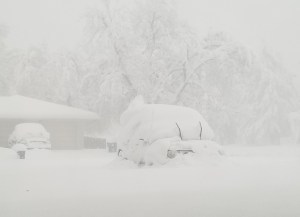 This. This is my son’s car last Sunday morning. Look closely and you can see his windshield wipers (that he’d lifted so they wouldn’t freeze to the glass), one headlight, and part of a wheel. On Saturday evening, there were flakes falling…but only wet pavement. So while the weatherman had predicted such a storm, we were still surprised to see this when we awoke. And that was before it continued blizzarding all day Sunday leaving