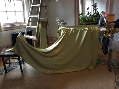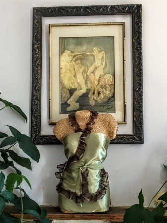 I wasted no time pinning one onto Judy. It was a natural. Last year Kat sent me 40 pounds of fabrics, much of it stored for up to 25 years. In the poundage was a generous yardage of 60″ wide green polyester faux silk.