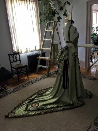 540 inches of ruffled salvaged ribbon was sewn onto the hem. The decals from the 2nd pillow sham were cut out, and positioned strategically onto the gown. Then began the fun of designing the bustle.