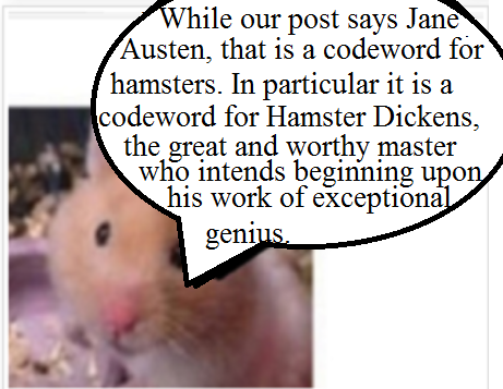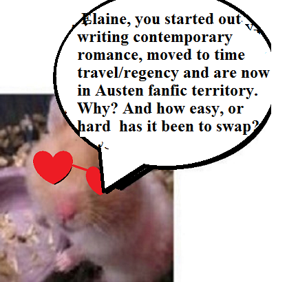 ELAINE JEREMIAH. Uhmmmmmm. Well…uhm…as I mentioned, I’m writing book 3 in my Jane Austen-inspired time travel romance trilogy. And that would be hard to do in hamster cage. It’s called ‘Captivated in Time’. So maybe one day I might be very willing to…might even enjoy..living in hamster cage. What’s more, I’ve more or less plotted it out, so I pretty much know what’s going to happen. I know the ending! So this could be sooner rather than later. I’m trying to keep the momentum going – I tend to write quite slowly, so I want to try and make more time for writing and get this one finished as soon as I can. After that, I plan to write more Darcy/Elizabeth Regency era ‘Pride and Prejudice’ variations. That’s what’s most popular within JAFF and actually I feel that writing in Regency-esque language is what I’m most comfortable doing. I feel like I’ve finally found my niche. Just maybe not in a hamster cage. …. But look on the bright side of keeping all that voddie to yourselves.