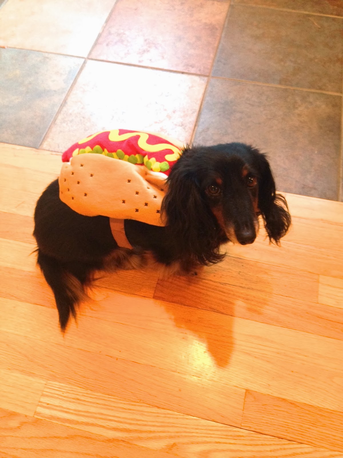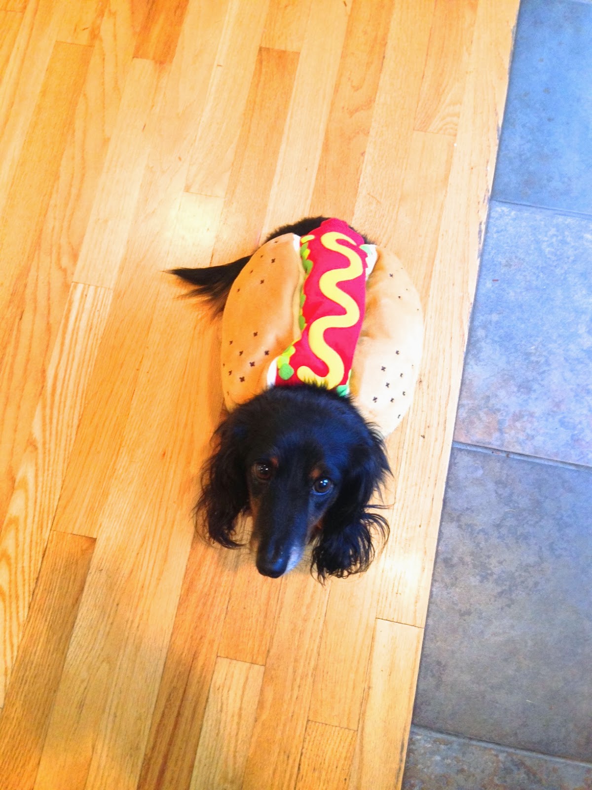 ...is what my dog thought when I forced her to wear this humiliating hot dog costume.