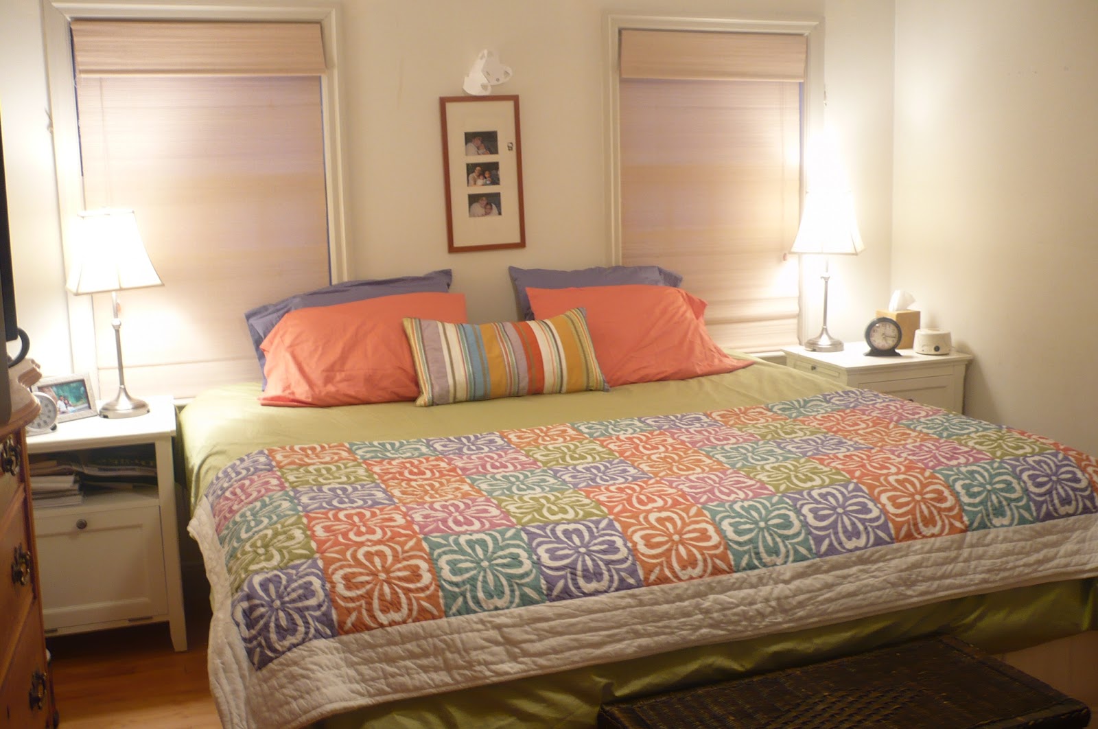 AFTER: Schwing! Color! All new bedding. (Which I must now protect from Miss Lightfingers).I'm also going to paint. What color? Blue? Teal? Purple?