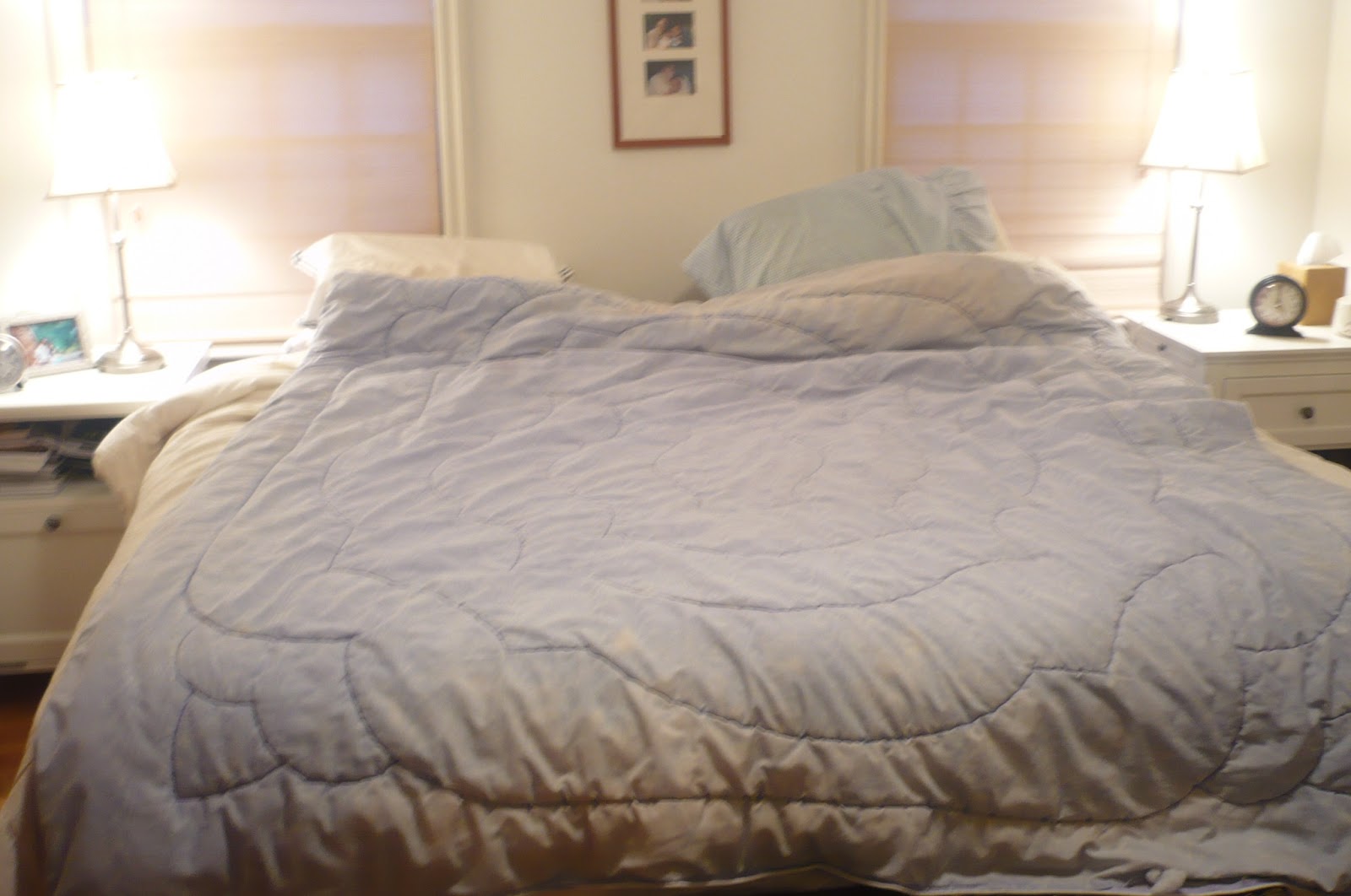 3. My 9 year old daughter ransacked my bedroom. She took all the good pillows, quilts, blankets, and accessories from my bed and put them in her room. (Her bed looks like the Princess and the Pea). Anyhow, I decided to perk up my room with a colorful new ensemble. Here are the before and after pics....