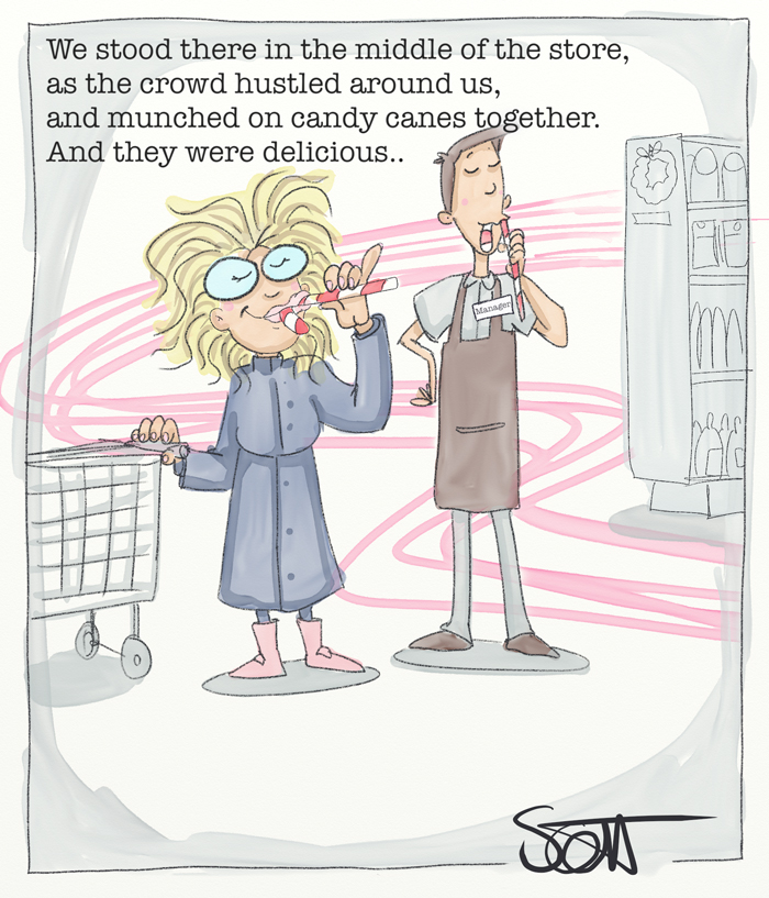 Scott Fiander has done it again! Made me laugh so hard my dog freaked out. He was inspired by several of my recent posts. The illustration above, titled "Penny In The ER" is a reference to my trip to the ER. The one below, "Christmas Spirit In A Candy Cane" was inspired by yesterday's post. How I love these! Merry Christmas to me. Thanks, Scott!
