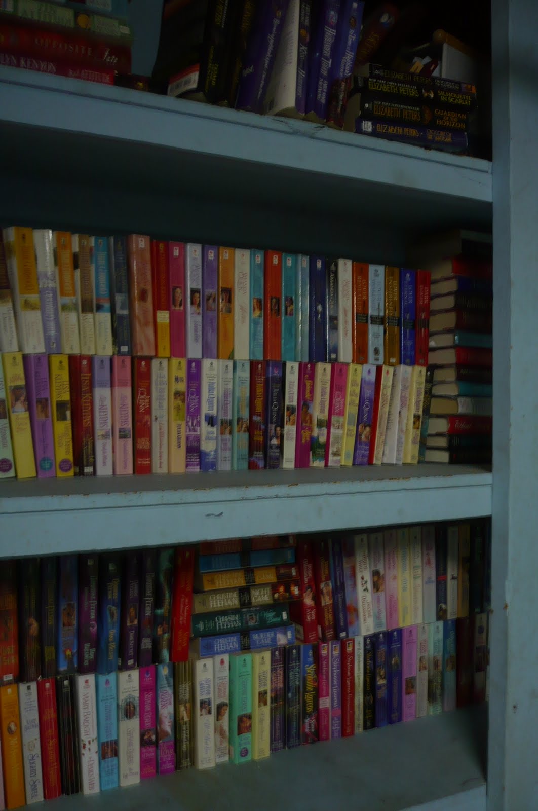 I am in the midst of a fairly traumatic undertaking at the moment. Cleaning out my romance novel collection in the basement. I have hundreds and hundreds of print books piled up and I finally decided to take the bulk of them to a wonderful little used book store that specializes in romance. The photo above shows the books I absolutely refuse to part with. Most of these are books that I re-read often....such as Amanda Quick, Julie Garwood, Christine Feehan, Stephanie Laurens, etc. I also have old favorites by Julia Quinn, Lisa Kleypas, Mary Balogh, JR Ward, and others. I kept my all-time favorite top 20 re-reads, which include some contemporary, some erotica, historicals, etc.