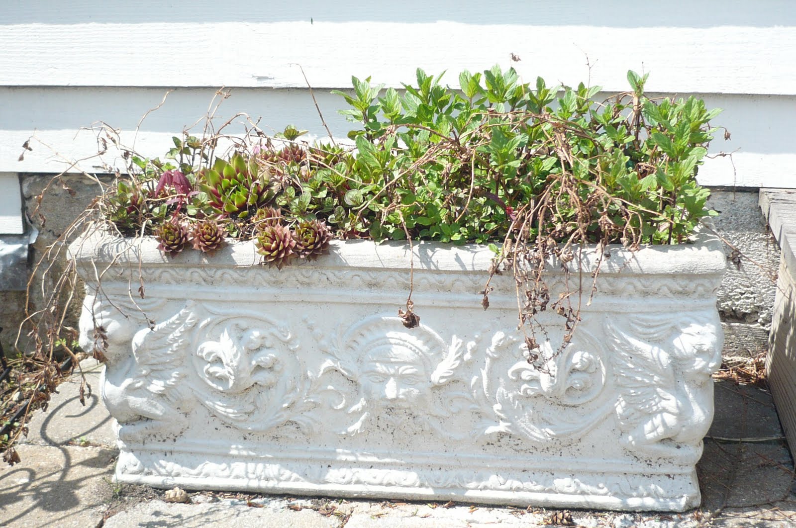 Here is my planter from last summer. The hens-and-chickens are green, and the mint, as always, reappeared. It's a great idea to keep mint in a container so it won't take over the herb garden.