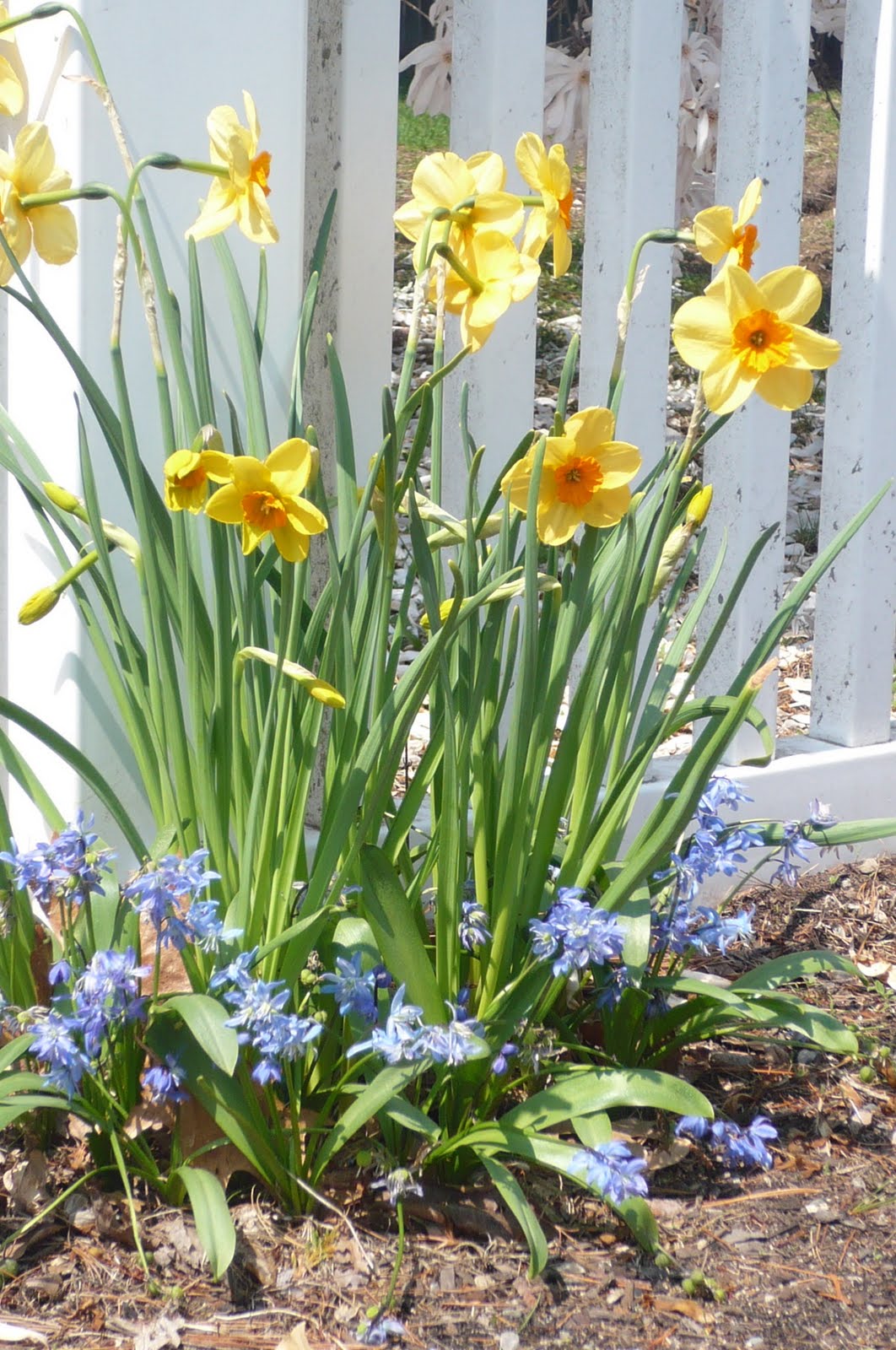 "Operation Daffodil" was a success! I planted hundreds of bulbs, and they all came up this spring. Unfortunately, the bunnies ate the crocuses, but everything else looks great. These are Siberian Squill (Scilla) and Short Cup Daffodils.
