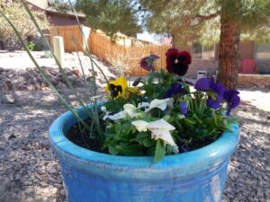 Sunday I spent some time in the yard, enjoying the sunshine and warm weather. I watered the two flower pots out front that have pansies in them. They’ve been there five days and the javelina haven’t found them yet. They like to snack on the flowers, pulling them up by the roots, eating the flower part and spreading root balls and dirt in all directions. So far so good. I also watered my lavender and my fruit trees. A good long soak to get deep to the roots. Then, my biggest challenge was to repot my jade plant. I’d put it in a pretty but narrow necked jar two years ago and it was definitely looking like it needed repotting. The problem was to get it out of the jar. It wasn’t easy. I soaked the root ball and slid my hand down into the jar and around the root ball to break it up. With a lot of effort, I got it out but minus the lower third of the roots. I repotted it in a wide mouth pot this time and watered it well. Cross your fingers for it to survive the abuse.