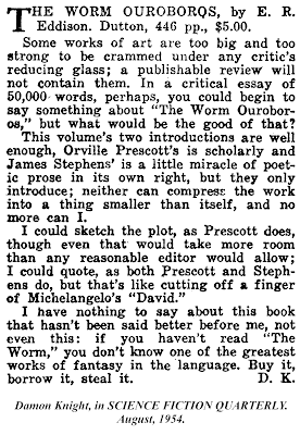 E. R. Eddison's THE WORM OUROBOROS remains one of the greatest of all fantasy books. Reading it for a third time, I find my reaction as it was before: I wish I could love it.