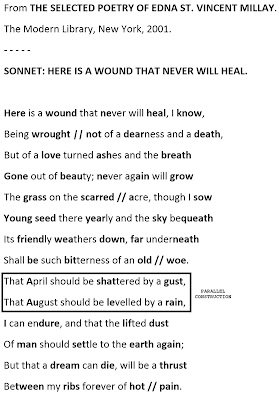 Click on this image for a larger view.One of the many things I love about metrical substitution is that it can guide you to read a poem in a certain way, and when used with harsh, clashing combinations of sound, it can force a poem's impact right down to your bones.In this example, here and there an iamb has been replaced by a spondee, a foot with two-equally stressed syllables, to produce a hammering that forces the reader to pause: