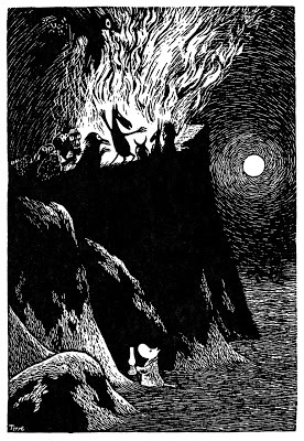 "Frighten me if you can," he thought happily. "I'm wise to you now. You're no worse than anything else when one gets to know you. Now you won't be able to pull my leg any more."In the previous books, in his will to adventure and his bravery, Moomintroll was very much the son of his father; here, in his compassion, in his concern for home and family, in his willingess to endure with patience, he becomes the son of his mother. This gives a haunting poignancy to his reunion with her in the spring time: