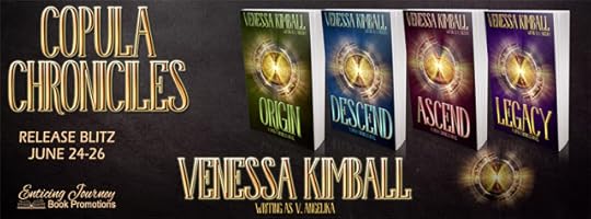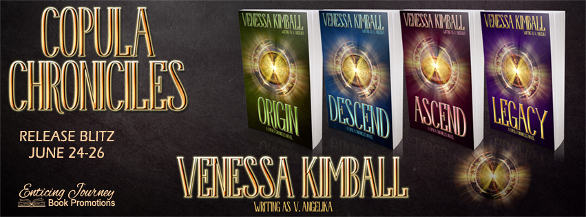 Series: The Copula Chronicles Titles: Origin, Descend, Ascend & Legacy Author: Venessa Kimball writing as V. Angelika Genre: New Adult, Urban Fantasy Release Date: June 24, 2016