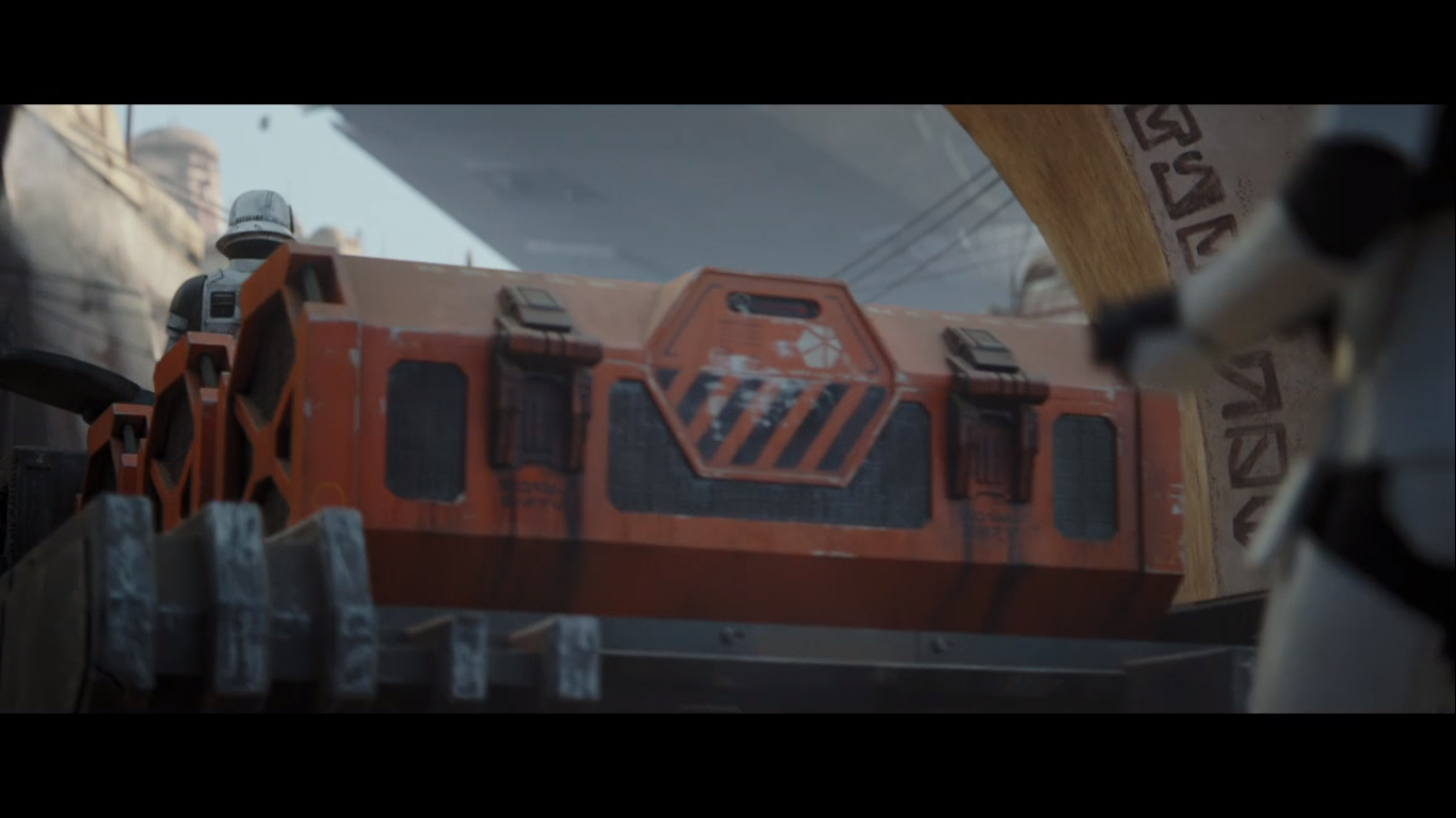 The next scene, almost immediately after scene 1, is a sweeping view of the Mos Eisley space port with the Razor Crest coming in for a landing. The match comes from when Luke, Ben and the droids are checking out the city for the first time.