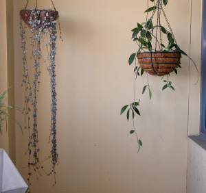 I was out on my balcony, watering what is now a very small collection of plants,when I got down to the far end where I have two hanging baskets – a chain-of-hearts and a hoya. What particular kind (genus?) of hoya it is, I know not: I bought it at Plants-R-Us roughly 5 years ago, when a dear friend drove me there one Sunday morning. I believe it did have a label on it; but it hasn’t had for most of that time.