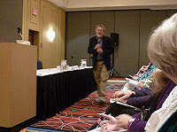 If anything, Saturday was even busier than Friday. I saw that Michael Hauge was doing another workshop, so decided to get another fix. Unfortunately, they had given him a room half the size of the one yesterday (which had been full), and people were lining the walls. I decided to sit on the floor at the front of the room.