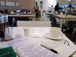 Hard at work at my local Waitrose!I had the scene all planned out, but I couldn't get my head in the right place to put it down on paper. So what did I do? I went shopping. No, not shoe shopping - grocery shopping. Writing in cafes is my trick when I can't seem to settle to write at home. Nothing to distract me there, especially if I take pen and paper and d...