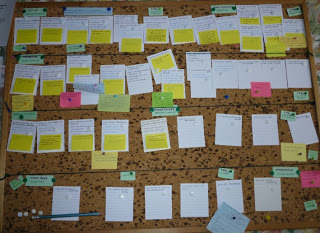 I thought I'd mention a bit about how I use the cards and Post-Its on my plotboard before I get into detail about the different sections of the board.