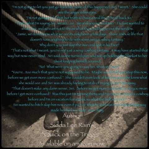 Soooo....been awhile-sorry. Been a busy girl and such but I know I completely need to upgrade my blogging skills. Novella-big ol' fat check mark! Done! Yay! ~Sweet as Candy~ has been completed and is being proofed and reviewed and I'm excited for its future. I'm not going to lie...I had my OWN serious doubts about the novella itself. I have a hard time believing that I can get a full story crammed into such a little word count BUT I think I just may have done it! When I read I like a BOOK a big, fat, hard...what was I talking about? OH! A book! I don't want no short, short book. I like 'em long. Nothing worse than thinking you are getting a full length one and once you start you find out-kidding its a mini! BOOKS PEOPLE! As a avid amazon customer I download with the best of them but sometimes get tricked into buying what I think is a novel only to find out its a measly little 4,000 word short story. I paid $3 for that? Never, never again I say! A week later....sh*t I paid $1.99 for a 3,500 short? I didn't want people having these reactions to my novella so no matter how hard I tried to tell myself that if I posted word count and was honest they would no what they were getting into. Can't do it! I just can't! I want readers to know I want to give them a good story at a fair price. I read this article the other day saying new indie authors need to have; a short story, novella, novel, boxed set and there was another thing-which I can't remember....great now I'm going to fail! Anyways, it said to have new product aka written work out there every 30 days. Ummmm....how in the hell am I supposed to do that? I wish I wrote 20,000 words a day but sorry to disappoint I tend to type around 2,000-5,000 on days when I'm feeling chatty. I have no doubt there are authors out there that can do it. I mean I just saw Jasinda Wilder has a treadmill she can walk on while she types...I can barely walk while chewing gum. Not trying to be funny there...it's true. I am trying my hand at the novella idea and I'm coming around to love the idea of the Crooked E Ranch series but I'm not sure i could ever publish a short story or a collection of them. I'm all over the novel part but I'm planning on hopefully releasing 2 a year not one every 30 days. Boxed set? I'm game BUT you have to have enough to make a boxed set. So, here I stand again...reading, attempting to follow advice from fellow authors but yet again I have to twist and turn everything to work for me. I know, I know that's not how it's supposed to work but what the hell call me a pathfinder or a trailblazer-ohhh I like that one! Makes it sound like I'm doing something amazing instead of trying to attempt this without being a failure. I've been social networking my lil' heart out...I've come to hate the word Tweet and my left eye starts twitching when I read the word "status" but I'm doing it! Yet, I see my sales rank number slowly getting worse. Less and less people are downloading ~Quick on the Trigger~ but what do I expect right? It's been downloaded thousands of times and hopefully word of mouth will keep it moving somewhat and that takes time. I've come to accept that it's time to move on. Let ~Quick on the Trigger~ wonder freely through the big bad world of published works and move forward with my life...as an author. Move onto the 2nd novel in the DIRTY DENIM series ~Steel Horse Cowboy~ not just writing but promoting, pushing basically pimping. As well as pimping my novella ~Sweet As Candy~. Time to move on but like an crazy ex I can't help looking back, I can't help spying on sales rank, I can't help stalking Google I can't help trying to bait ~Quick on the Trigger~ into becoming a runaway success through bloggers, pages, reviewers, Ect. ~Sweet as Candy~ has been MAN approved! I love that! Women, we tend to thrive on the written word like a lifeline. Men-not so much. Now, now, calm down! Not all men but the kind I'm talking about. The kind of men who are doers, physical worker bees, alpha tendencies-at least some. There is something special when I get one of those kind and they like my work. I write erotic romance so a I take "gave me a hard on" or "that was f*ckin' hot" as a major compliment. Where most women praise the storyline or characters the men tend to praise the scenes or the banter. That's good, that's exactly what I want. I want a book the wifey can read and then hand over and hubby likes it to-who wouldn't want that? Novel-conquered, novella-conquering, social media-I got that sh*t covered, blogging-work in progress...next adventure in self pubbing? (Insert theme from Jaws here-hello, shark week people!). Next adventure for Miss Sidda Lee Rain to attempt...BLOG TOUR! Yep, a frickin' blog tour!?!? Me and a blog tour...perhaps this is the one I won't succeed at, maybe it's the one I'll fall flat on my face on but I as I walk through the valley of the shadow of...okay maybe that's a little "quick on the trigger" (see what I did there?) like everything I'm going to research and ask a million questions and drive everyone crazy I figured or I could just set it up with an outside vendor. That sounds perfect! Someone who knows what they are doing! Someone who tells me what I need to write about and to who, what I need to send, what to sign...oh yeah sounds perfect! Now...to find the right vendor? Sh*t and to think I once thought I'll just "toss it up on amazon"!
