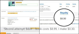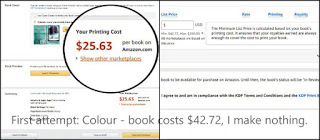 Print on demand? Man plans, God laughs—so the saying goes, and I imagine the divine one had a good old chuckle about me. I had my PDFs (with the type spaced as best as I could make it); I had my covers made (for the second time). All I had to do was upload them and set the pricing, right? I’d chosen to have colour interiors—not that there’s a lot of colour apart from the small bright red logo of the imprint at the front, a tattered, yellowed recipe book cover in the back matter, and a tastefully-washed out photo of yours truly. Then why bother? Because I was mistakenly under the impression that the printing costs for both were the same. The fixed charge for both full-colour and B&W books is $0.85c, if they’re between 42 and 500 pages. I’d done the math, and figured I could still charge $2.99 per book. So imagine my surprise at my first attempt.