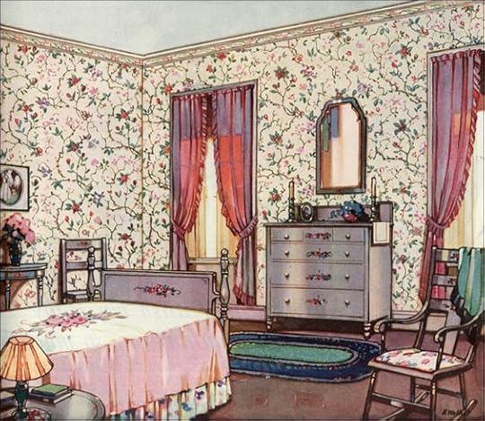 Today I am lining the drawers of my new/old walnut dressing table with floral paper fragranced with roses and hanging scented sachets among the clothes hanging in the his and hers matching wardrobes we fight to open with little brass keys. I have bedroom furniture! Clunky, brown and deliciously old-fashioned – just right for this high-ceiling room with its cast iron fireplace and picture rails.