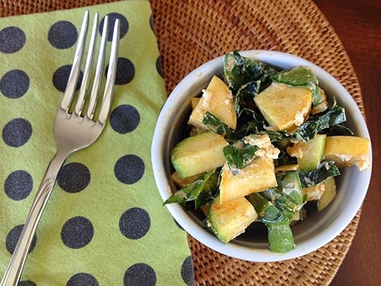 category Saladcuisine Raw, Veganingredients1 yellow squash, chopped1 zucchini, chopped1 handful spinach, chopped small1/8 C crumbled goat cheese feta1 leaf of kale, chopped small1-2 shakes smoked paprikaDressing
