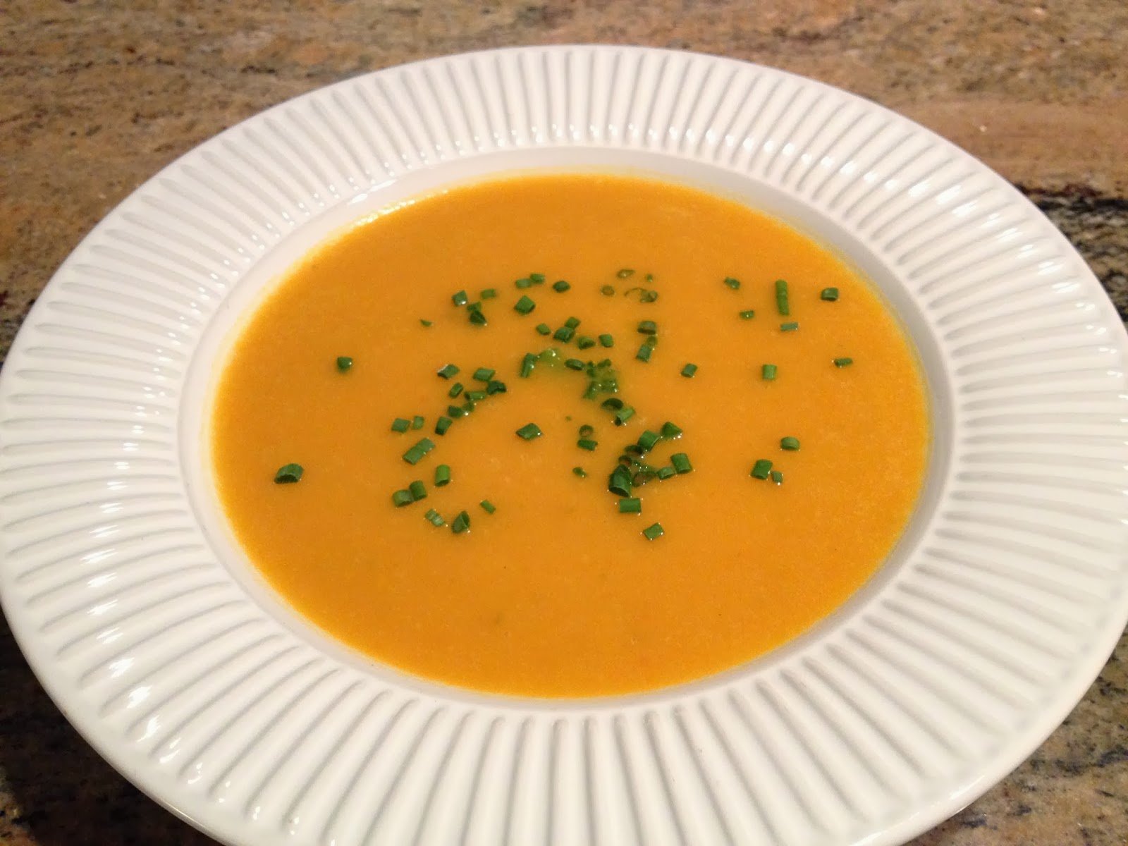 ingredients1 Tbsp olive oil4 carrots, chopped1 small onion, chopped1 minced garlic clove3 Tbsp of peeled and diced fresh ginger1 C peeled and cubed butternut squash1 cored and diced apple4 C (1 32 oz box) vegetable broth1/2 tsp sea salt1/2 tsp tumeric1 (14oz) can of light coconut milk1 peeled and diced pear for garnish2 tsp finely chopped chives for garnish