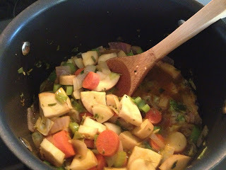 Ingredients1 Tbsp olive oil1/2 onion, chopped1 clove garlic, crushed11/2 C water or vegetable broth1/2 tsp basil (or 11/2 Tbsp fresh chopped)1 parsnip, chopped1 celery stalk, sliced1 carrot, chopped1 C chopped cabbage1 broccoli stalk, separated into small pieces1 15oz can blackeyed peas
