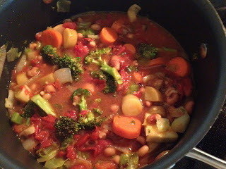 3 Tbsp olive oil1 leek, top and bootom trimmed, sliced into half-moons1 yellow onion, diced2 carrots, 1/2 inch slices3 celery stalks, 1/2 inch slices3 cloves of garlic, minced1 tsp sea salt2 zuchinni, half length-wise and sliced1/2 cabbage, chiffonade (thin slices)1 tsp oregano1/2 tsp pepper2 vegan sausages, sliced thin (1 spicy, 1 mild Tofurky sausage)1 32 oz box of vegetable broth1 32 oz box of low-sodium vegetble broth1 14.5 oz can chopped tomatoes1 14.5 oz can cannelline beans, drained and rinsed1 C rigatonni, penne or rotelle pastaDirections1. Heat 2 Tbsp olive oil in large soup pot over medium heat. Saute leek, onion, carrots celery and garlic with salt for 10 minutes stirring frequently to prevent browning.2. Add zucchiini, cabbage, oregano and pepper,. Saute an additonal 10 minutes adding additional olve oil if needed.3. Brown the sausages in a pan over medium heat with a bit of olive oil. Stir while cooking about 5 minutes.4. Add broth, tomatoes, beans and cooked sausage to veggies. Bring to a boil then lower heat and simmer for 30 minutes.5. Cook pasta in sauce pan of boiling water. Test for al dente. Drain and set aside.6. Place a serving of pasta in individual bowls and ladle soup on top. (Non-vegan option: sprinkle grated Monchego [goat] cheese on top)