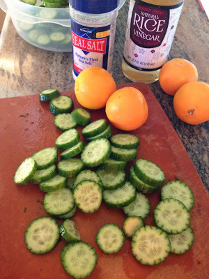 directions1. Wash and score cucumbers along length with a fork and slice thinly. Sprinkle with sea salt and set aside for 30 minutes.2. Soak wakame for 15 minutes in cold water, drain and chop.3. Drain excess liquid from cucumbers. Check for saltiness. Rinse lightly if too salty then pat dry. Add wakame to cucumbers.4. Peel and segment the oranges.5. Whisk together remaining ingredients (except sesame seeds) and pour over vegetables. Toss with oranges segments.6. Refrigerate until ready to serve. Sprinkle with sesame seeds or Gomasio and enjoy.