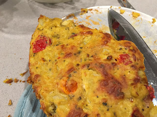 directions1. Preheat oven to 400 degrees..2. Steam or roast cauliflower until tender, about 12 minutes. Set aside.3. In a small skillet, heat olive oil over medium heat. Add garlic and sauce until fragrant. Scrape garlic into a large bowl.4. Add eggs and basil to bowl and whisk ingredients. Add dry ingredients, seasonings and Parmesan. Whisk until smooth.5. Gently stir in cauliflower and tomatoes.