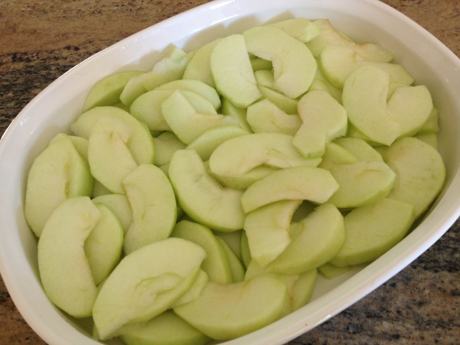 Pick a tart and sweet apple, like Granny Smith, Pippin or Pink Lady. Have the lemon juice ready to sprinkle on the apples because they start to brown quickly. I recommend you peel, core, cut, add to baking dish and sprinkle with lemon juice one apple at a time.
