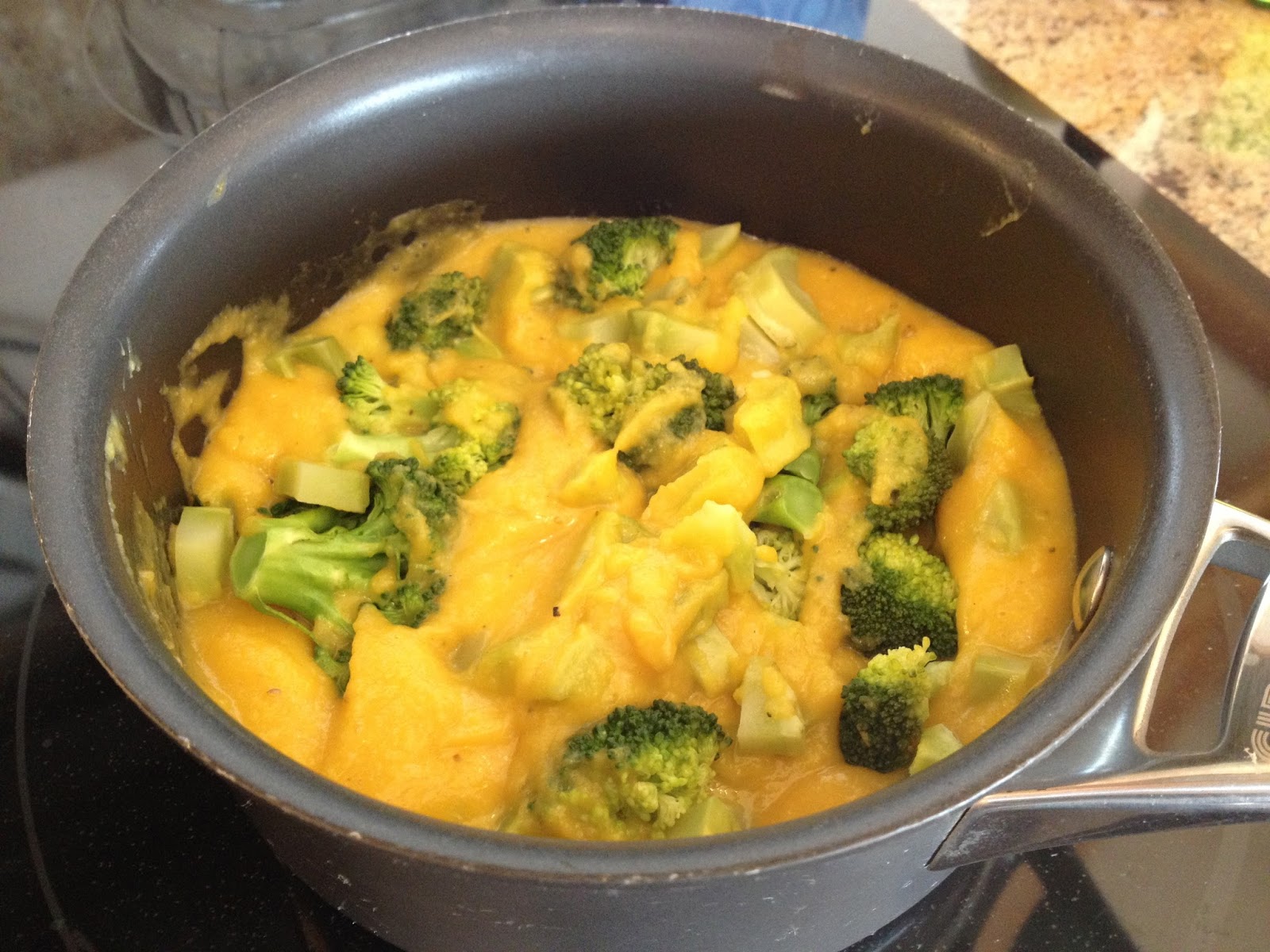 Bring creamy sauce to a low boil and add broccoli and pasta then mix gently with a wooden spoon. Serve and observe.