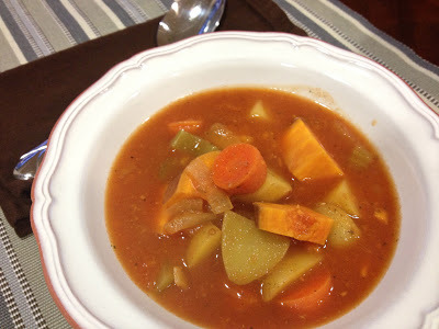 I made this stew on the stovetop, but you can also use a crockpot. If you do, slice the yam (rather than cube it) or it will become too soft. Add the veggies to the crockpot in the following order: carrots, potatoes, beets/turnips, yam, celery and onions. Blend the tomatoes, seasoning and dates and pour over top. No broth needed.