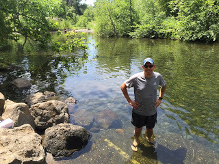 For Memorial Day weekend we took a road trip up the state (California) to the college town of Chico where my husband Bob earned his finance degree. He always raved about Bidwell Park, which followed Big Chico Creek through a portion of the town. There are miles of paved trails under a shady canopy of large trees and lush greenery bordering the creek. Picnic benches dot the route offering an invitation to stop and enjoy the cool creek.