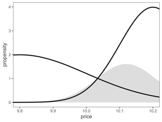 Buyer, seller, and joint (shaded) propensity curvesThis is a very intuitive way of understanding transactions. The buyer has a certain force pulling down towards the lower price, and the seller is trying to pull it up to a higher price. The probability of transacting is going to scale depending on a number of factors including the spread or the distance between the buyer and the seller optimal prices – if there’s a big gap between them then the probability of a transaction occurring will be lower.