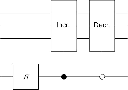 There is a quantum circuit which does the quantum version of a random walk. It consists of a gate we have already seen which increments a counter (interpreted as a step to the right), another which decrements a counter (a step to the left), and in addition there is a Hadamard gate which puts the bottom control qubit into a superposition state. The empty control circle means the control is active when the qubit is in the state